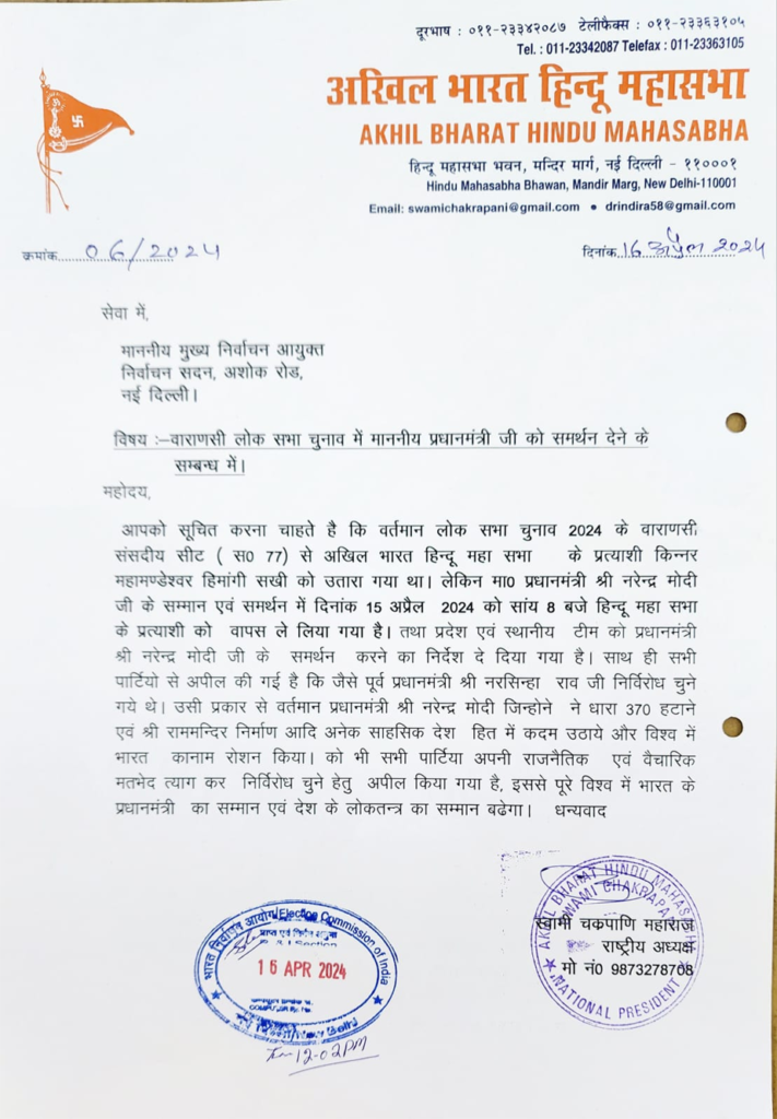 उन्होंने कहा कि हिंदू महासभा के बैनर तले वाराणसी लोकसभा सीट पर उतारे गए प्रत्याशी को वापस लेने का निर्णय लिया गया है। इसके साथ ही अन्य दलों से भी मैं निवेदन करता हूं कि प्रधानमंत्री के सम्मान में उनके समक्ष खड़े प्रत्याशी को हटा देना चाहिए। क्योंकि जब नरसिम्हा राव जब दक्षिण भारत से चुनाव लड़े थे, तब उनके सम्मान में सभी पार्टियों ने अपने प्रत्याशी हटा लिए थे। उस समय नरसिम्हा राव निर्विरोध चुन गए थे।